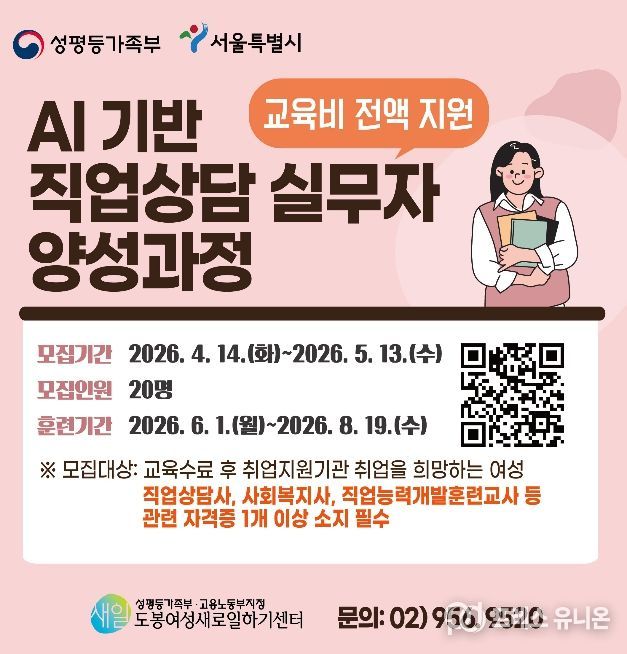 프레스유니온 강찬희 기자 | 서울 도봉구가 도봉여성센터에서 ‘AI 기반 직업상담 실무자 양성과정’을 운영한다고 밝혔다. 대상은 직업상담사, 사회복지사, 직업능력개발훈련교사 등의 자격증을 소지하고, 취업지원 분야로 취업을 희망하는 여성 구직자다.