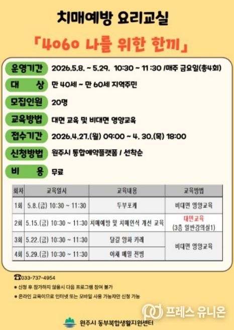 프레스유니온 강찬희 기자 | 원주시 동부복합생활지원센터는 오는 27일부터 치매 예방을 위한 요리교실 ‘4060 나를 위한 한끼’ 참여자를 모집한다.