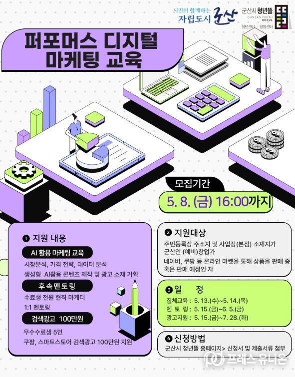 프레스유니온 강찬희 기자 | 군산시 청년뜰 창업센터가 4월 20일부터 5월 8일까지 지역 온라인 창업가의 디지털 마케팅 역량 강화를 위한 '2026년 퍼포먼스 디지털 마케팅 교육' 참여자를 모집한다.