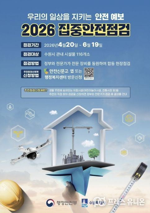 프레스유니온 김성길 기자 | 수원특례시가 안전사고를 예방하고, 시민의 안전 의식을 고취하기 위해 20일부터 6월 19일까지 ‘2026년 집중안전점검’을 한다.