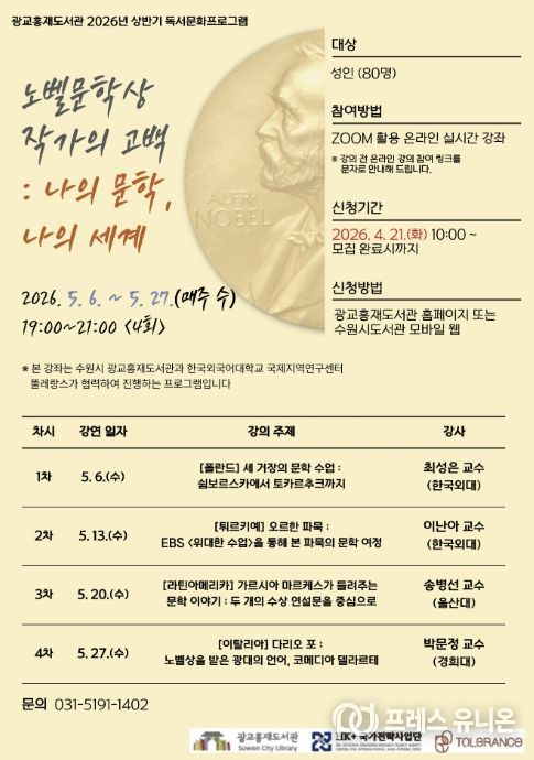 프레스유니온 김성길 기자 | 수원시 광교홍재도서관이 한국외국어대학교와 협력해 진행하는 2026년 세계문화기행 시리즈 1편 ‘노벨문학상 작가의 고백 : 나의 문학, 나의 세계’ 강좌를 수강할 시민을 모집한다.