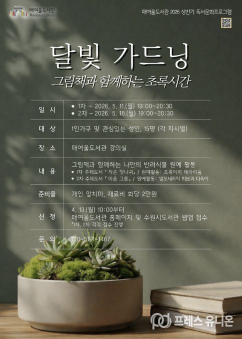 프레스유니온 김성길 기자 | 수원시 매여울도서관이 그림책 읽기와 식물 가드닝을 결합한 체험형 프로그램 ‘달빛 가드닝, 그림책과 함께하는 초록시간’을 운영한다.