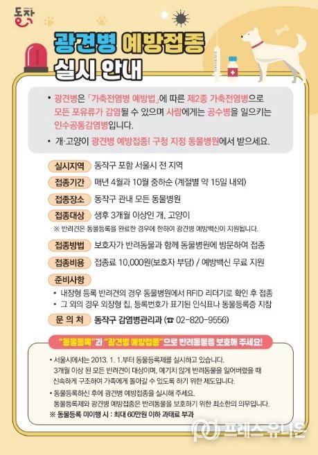 프레스유니온 강찬희 기자 | 동작구가 반려동물과 주민의 안전을 위해 봄철 광견병 예방접종을 실시한다고 밝혔다.