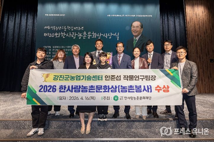 프레스유니온 강찬희 기자 | 강진군은 한사랑농촌문화재단이 주관하는 ‘한사랑농촌문화상’ 농촌봉사 부문에서 강진군 농업기술센터 안준섭 작물연구팀장이 수상의 영예를 안았다고 20일 밝혔다.