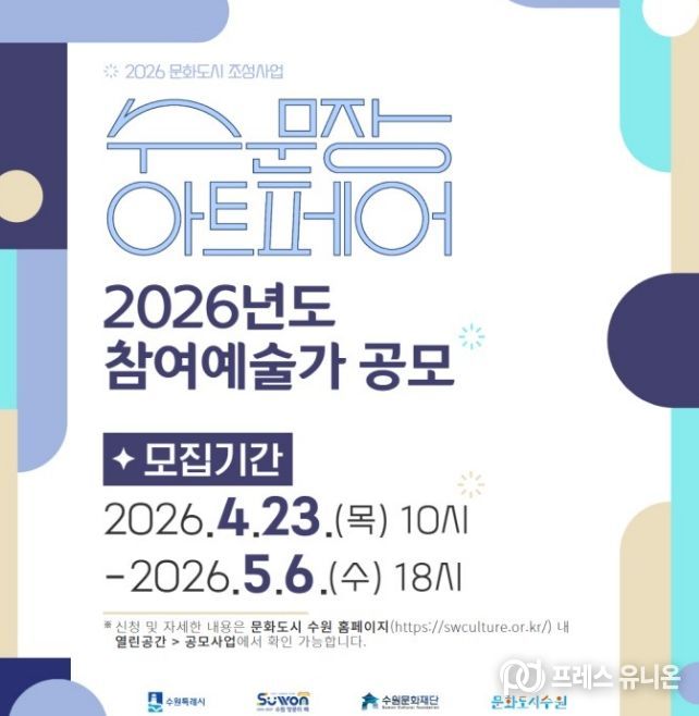 프레스유니온 김성길 기자 | 수원문화재단은 지역 예술가의 작품 판로 확대와 지속가능한 창작 활동 기반 마련을 위해 2026년 ‘수문장 아트페어’ 참여 예술가를 모집한다.