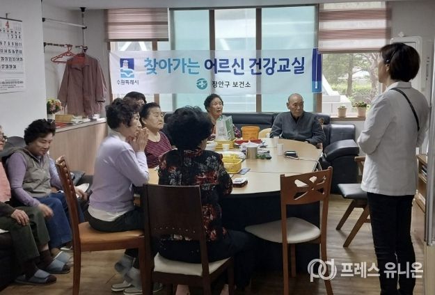 프레스유니온 김성길 기자 | 수원시 장안구 송죽동은 지난 17일, 관내 로얄팰리스 경로당에서 '찾아가는 어르신 건강교실' 프로그램을 운영했다.