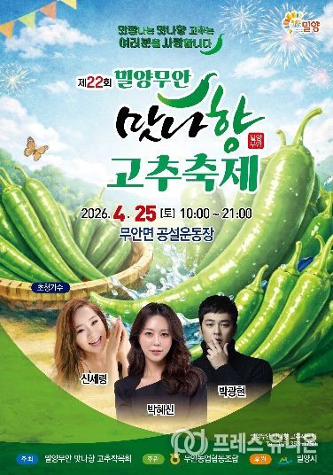 프레스유니온 강찬희 기자 | 경남 밀양시는 오는 25일 무안면 공설운동장 일원에서 ‘제22회 밀양무안맛나향 고추 축제’를 개최한다.