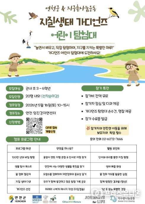 연천군이 주최하고 국제개발협력 NGO 지구촌나눔운동이 주관하는 이번 캠프는 오는 5월 16일 토요일에 진행될 예정이며, 참가 학생들이 연천의 대표적인 지질·생태 자원을 직접 탐사하고 체험하는 과정을 통해 지역의 가치를 이해하고 환경 보전의 중요성을 배울 수 있도록 마련됐다.