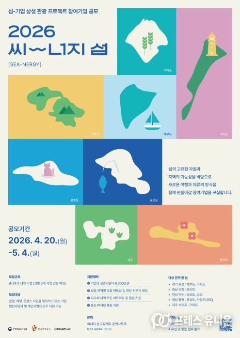 프레스유니온 강찬희 기자 | 문화체육관광부가 주최하고 한국관광공사가 주관한 2026년 씨너지『섬-기업 상생 관광프로젝트』 참여기업 공모를 오는 4월 20일 월요일 부터 5월 4일 월요일까지 모집한다.