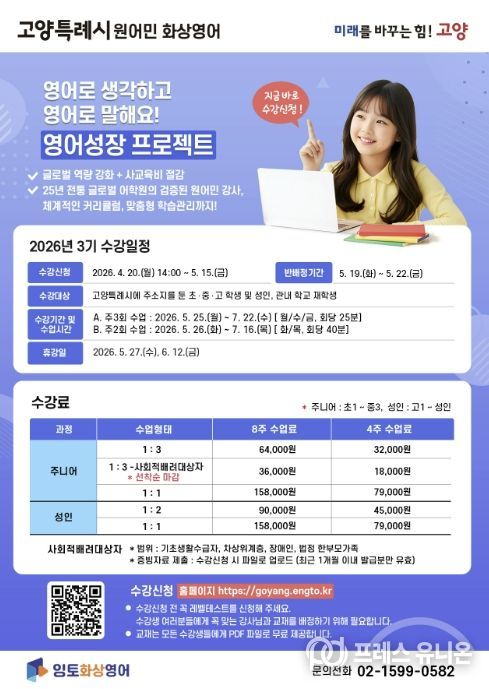 프레스유니온 김성길 기자 | 고양특례시는 글로벌 역량 강화와 사교육비 부담 완화를 위한 ‘원어민 화상영어’ 프로그램의 3기 수강생을 4월 20일부터 5월 15일까지 모집한다.