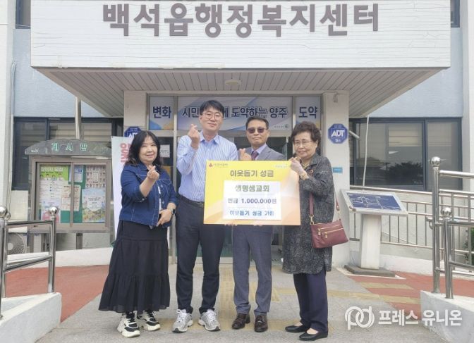 프레스유니온 김성길 기자 | 양주시 백석읍은 지난 17일 생명샘교회가 지역 내 어려운 이웃을 돕기 위한 성금 100만 원을 기탁했다고 밝혔다.