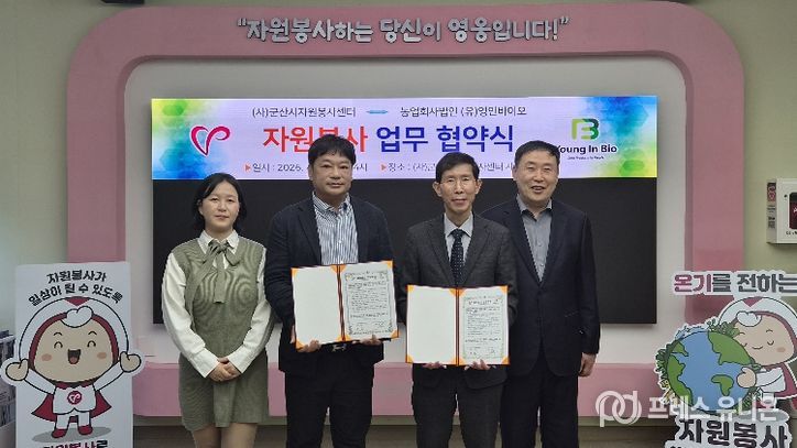 프레스유니온 강찬희 기자 | (사)군산시자원봉사센터(이사장 황진)와 농업회사법인 (유)영인바이오(대표 최인정)는 4월 20일 오후 2시, 군산시자원봉사센터 세미나실에서 자원봉사 활성화를 위한 업무협약(MOU)을 체결했다.