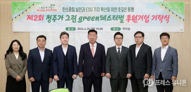 프레스유니온 강찬희 기자 | 청주시는 20일 시청 임시청사 직지실에서 ‘제2회 청주가 그린 Green 페스티벌’의 성공적인 개최를 위한 후원기업 기탁식을 개최했다.