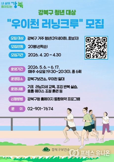 프레스유니온 강찬희 기자 | 서울 강북구가 청년층의 건강 증진과 생활 속 운동 습관 형성을 위해 ‘청년 러닝크루’ 참여자를 모집한다.