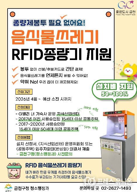 프레스유니온 강찬희 기자 | 금천구는 생활폐기물 직매립이 금지됨에 따라 음식물쓰레기 혼합배출을 예방하고 배출량을 줄이기 위해 2026년 음식물쓰레기 자동계량장비(RFID) 종량기 설치 지원을 신청받는다고 밝혔다.
