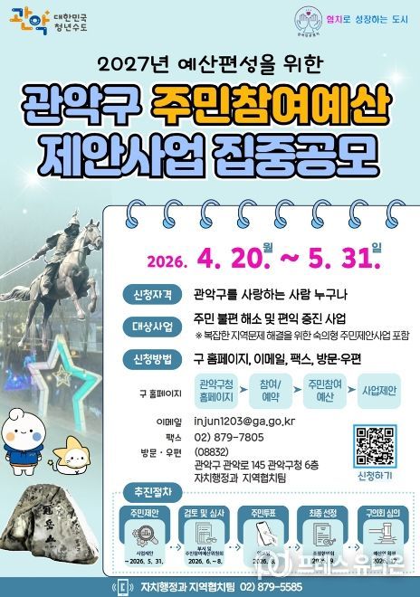 프레스유니온 강찬희 기자 | 관악구가 지역사회 문제를 해소하고 주민 편익을 증진하기 위해 ‘2026년도 주민참여예산사업 및 협치의제’ 공모를 실시한다.