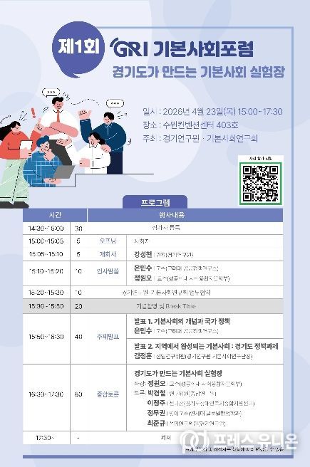 프레스유니온 김성길 기자 | 경기연구원은 오는 23일 오후 3시 수원컨벤션센터 403호에서 ‘경기도가 만드는 기본사회 실험장’을 주제로 ‘제1회 GRI 기본사회포럼’을 개최한다.