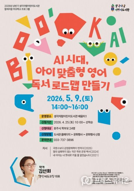 프레스유니온 강찬희 기자 | 원주시 생각자람어린이도서관은 다음 달 9일 오후 2시, ‘AI 시대, 아이 맞춤형 영어 독서 로드맵 만들기’를 주제로 5월 ‘함께자람 부모학교’ 프로그램을 운영한다.