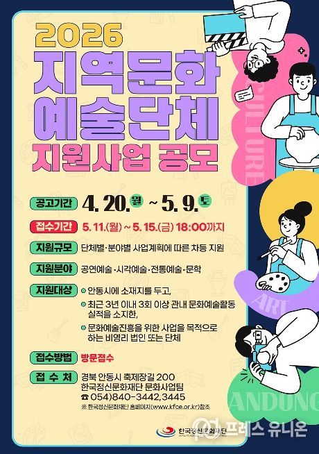 프레스유니온 강찬희 기자 | 안동시 한국정신문화재단은 5월 11일부터 5월 15일 18시까지 관내 문화예술단체를 대상으로 ‘지역문화예술단체 지원사업’ 참여단체를 공개 모집한다.
