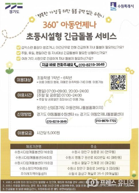 ‘초등시설형 긴급돌봄 서비스’는 갑자기 아동 돌봄이 필요할 때 요긴하다. 예상하지 못했던 출장이나 야근으로 퇴근이 예정보다 늦어지는 경우와 같은 돌발 상황에 모두 이용할 수 있다. 주말이나 휴일, 자정까지의 야간 시간 등은 물론 등교 전인 오전 7시부터 서비스를 제공한다. 장안구 2곳(연무동, 파장동), 권선구 1곳(호매실동), 팔달구 1곳(매교동), 영통구 1곳(매탄동) 등 총 5개 돌봄 기관에서 최대 8시간을 맡아준다. 경기도 아동언제나돌봄 홈페이지에서 온라인 신청할 수 있고, 경기도아동돌봄수원센터에 전화 신청할 수도 있다. 이용요금은 시간당 5천원이다.