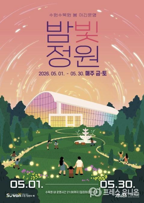 프레스유니온 김성길 기자 | 수원특례시가 5월 1일부터 30일까지 매주 금·토요일 일월·영흥수목원에서 ‘2026년 수원수목원 봄 밤빛정원’을 연다.