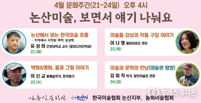 프레스유니온 강찬희 기자 | 김홍신문학관 문화교실이 4월 네번째주에 시작한다. 이번 달 주제는 미술인데, 21일 “논산에서 읽는 한국미술 흐름”을 시작으로 24일 향인미술관 탐방까지 이어진다.