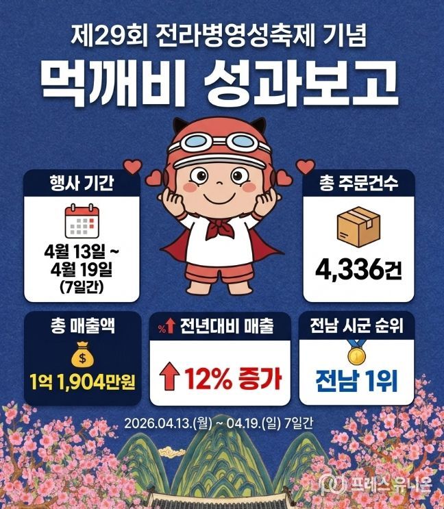 강진군은 지난 13일부터 19일까지 진행된 병영성축제 기념 먹깨비 할인이벤트를 통해 총 주문 건수 4,336건, 총매출액 1억 1,904만 원을 기록하며 성공적인 성적표를 받아들었다고 밝혔다.
