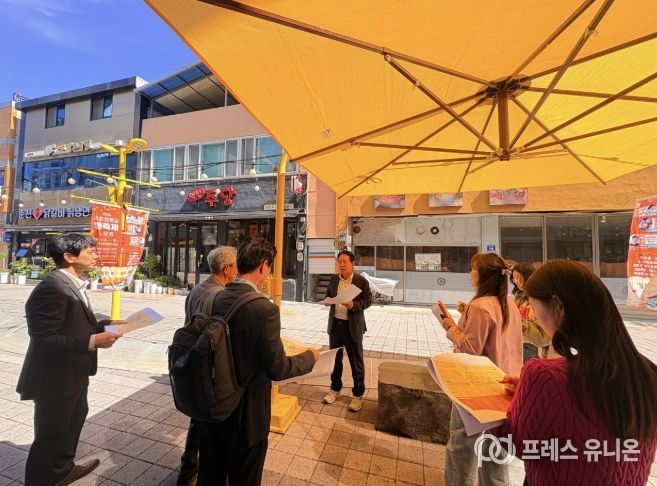 프레스유니온 강찬희 기자 | 문경시는 점촌원도심상권 점촌역 방향 200여 미터 구간에 ‘닻별 거리’ 조성 속도를 높이고 있다. 노란색 간판과 어닝을 새로 설치하고, 상징 조형물과 조형 벤치 등을 배치하며, 은하수 파고라 70미터 조명으로 거리를 화려하게 꾸민다.