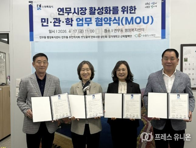 프레스유니온 김성길 기자 | 수원시 장안구 연무동 행정복지센터와 주민자치회, 반딧불이연무시장상인회, 경기대학교 산학협력단은 지난 17일, 각 기관의 긴밀한 상호 협력과 유대관계 강화를 위한 업무협약을 체결했다.