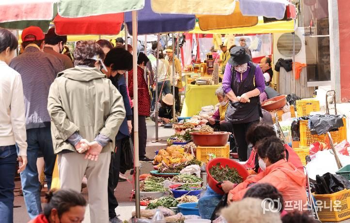 장터 곳곳에는 냉이, 달래, 쑥, 두릅 등 제철 봄나물이 풍성하게 진열돼 향긋한 봄의 정취를 전하고 있으며, 이를 찾는 관광객들의 발길이 이어지고 있다.