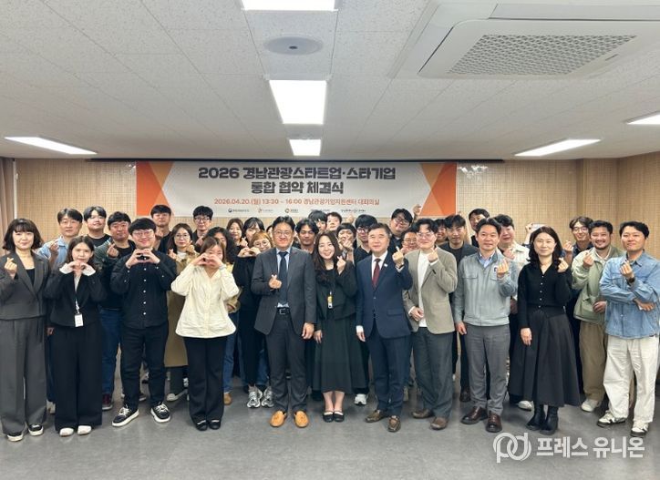 프레스유니온 강찬희 기자 | 경상남도는 경남관광재단 관광기업지원센터 주관으로 ‘2026 경남관광 스타트업 7기’에 최종 선정된 관광 스타트업 20개 기업과 20일 협약을 체결하고 본격적인 지원에 나선다고 밝혔다.