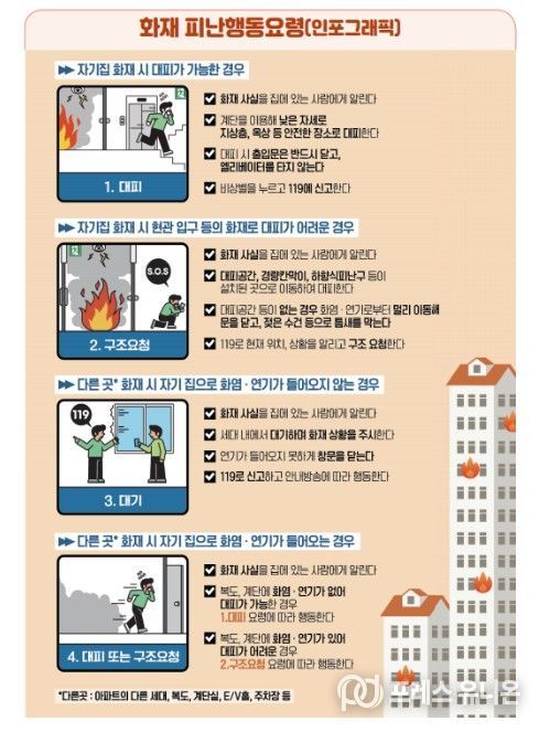프레스유니온 강찬희 기자 | 소방청은 최근 아파트 화재가 잇따라 발생함에 따라, 인명피해를 최소화하기 위해 무리한 대피보다는 화재 상황을 먼저 판단하고 행동하는 상황별 피난 행동요령을 철저히 준수해 줄 것을 당부한다고 17일 밝혔다.