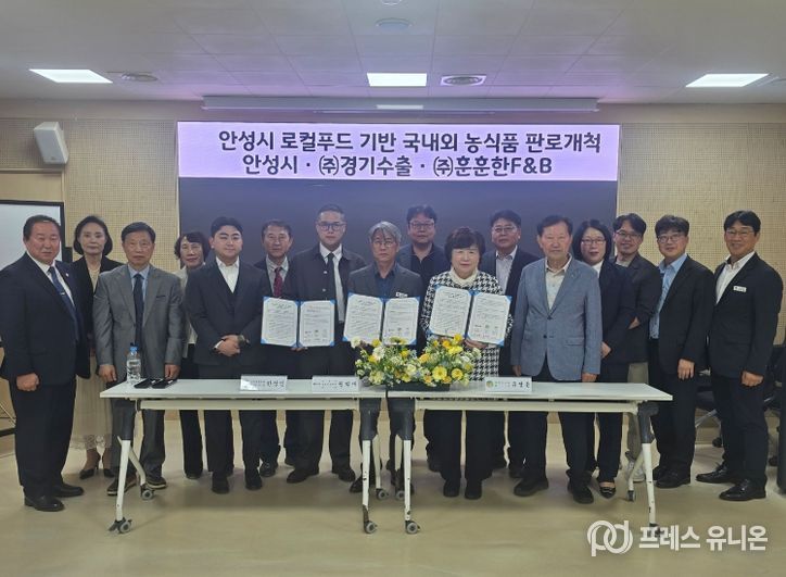 프레스유니온 김성길 기자 | 안성시 농업기술센터는 지난 4월 17일, 안성시 농특산물 및 농식품의 국내외 판로 확대를 위해 ㈜경기수출, ㈜훈훈한F&B와 전략적 업무협약(MOU)을 체결했다고 밝혔다.