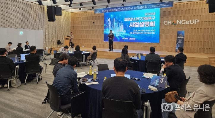 프레스유니온 강찬희 기자 | 포항강소특구육성센터는 21일 포항 체인지업그라운드에서 지역 중소·벤처기업과 유관기관 관계자 100여 명이 참석한 가운데, ‘2026년 포항 강소연구개발특구 사업설명회’를 개최했다.