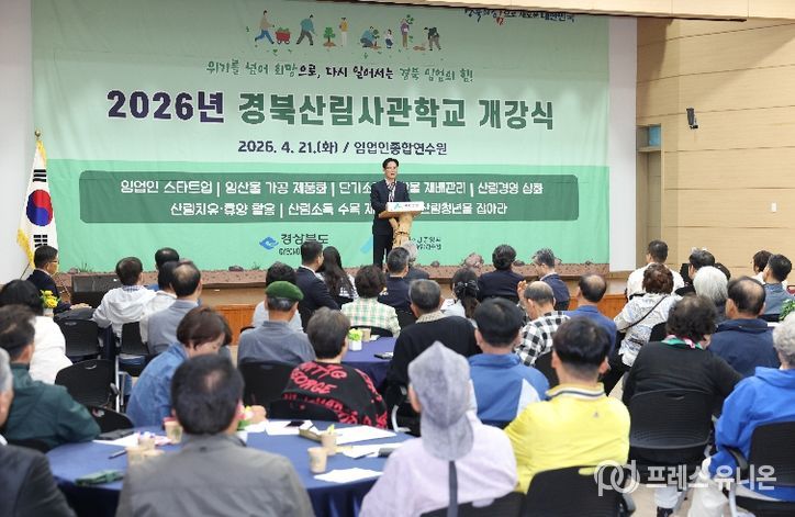 프레스유니온 강찬희 기자 | 경상북도는 4월 21일, 산림조합중앙회 임업인종합연수원에서 교육생 등 160명이 참석한 가운데 ‘2026년 경북산림사관학교 개강식’을 개최했다.