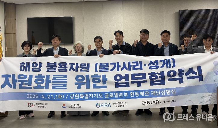 프레스유니온 강찬희 기자 | 강릉시는 21일 강원특별자치도청 글로벌본부 환동해관에서 강원특별자치도, 한국수산자원공단 동해본부, ㈜스타스테크와 함께 ‘해양 불용자원 자원화를 위한 업무협약’을 체결했다고 밝혔다.