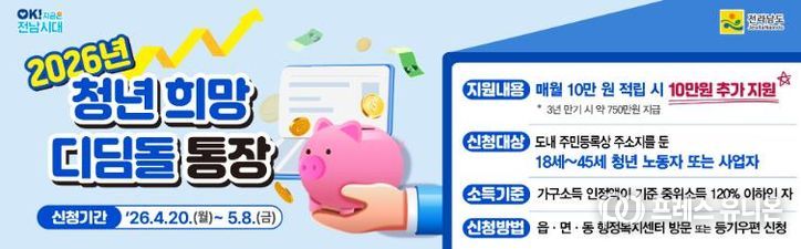 프레스유니온 강찬희 기자 | 전라남도는 지역에서 일하는 청년의 안정적 자립과 자산 형성을 돕기 위해 ‘청년 희망디딤돌 통장’ 대상자 750명을 모집한다고 밝혔다.