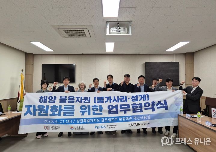 프레스유니온 강찬희 기자 | 강원특별자치도 제2청사(본부장 손창환)는 4월 21일 강원특별자치도청 제2청사 환동해관에서 강릉시, 한국수산자원공단, ㈜스타스테크와 함께 ‘해양 불용자원 자원화’를 위한 업무협약을 체결했다고 밝혔다.