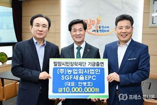 프레스유니온 강찬희 기자 | (재)밀양시민장학재단(이사장 안병구)은 21일 ㈜농업회사법인 SGF새울EPC(대표 안병호)로부터 지역 인재 육성을 위한 장학기금 1천만원을 기탁받았다고 밝혔다.