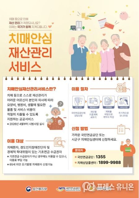 프레스유니온 강찬희 기자 | 보건복지부는 4월 22일부터 ‘치매안심재산관리서비스 시범사업’을 실시한다고 밝혔다. 주요 대상은 치매, 경도인지장애 등으로 인해 경제적 학대 위험이 있는 기초연금수급자이며, 국민연금공단 7개 지역본부*에서 상담 받을 수 있다.