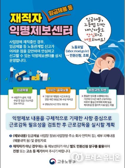 프레스유니온 강찬희 기자 | 고용노동부는 ‘숨어있는 체불’을 선제적으로 청산하고 포괄임금 오남용으로 인한 “공짜 노동”을 근절하기 위해 「재직자 익명제보 사업장 근로감독」을 4월 22일부터 약 2개월간 진행한다고 밝혔다.