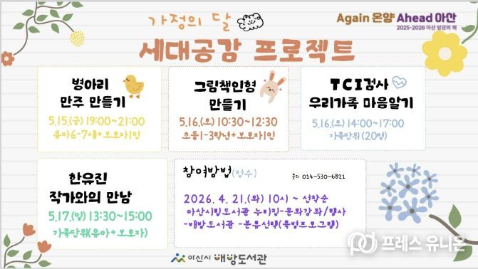 프레스유니온 강찬희 기자 | 아산시 배방도서관이 5월 가정의 달을 맞아 가족 간 소통과 유대감 강화를 위한 ‘세대공감 프로젝트’를 운영한다.