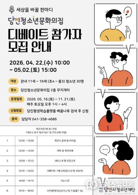 프레스유니온 강찬희 기자 | (재)당진시청소년재단 당진청소년문화의집에서는 5월 16일부터 11월 21일까지 매주 토요일마다 총 23회기에 걸쳐 관내 청소년(11세~16세) 30명을 대상으로 디베이트 프로그램이 진행될 예정이다.