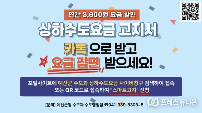 프레스유니온 강찬희 기자 | 예산군은 수도요금을 카카오톡 알림톡으로 간편하게 확인하고 납부할 수 있는 ‘스마트고지 서비스’ 이용을 늘리기 위해 홍보를 강화한다고 밝혔다.