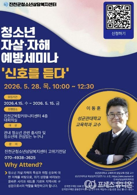 프레스유니온 김성길 기자 | 충북 진천군청소년상담복지센터는 오는 5월 28일 진천군복합커뮤니티센터에서 청소년 자살·자해 예방 세미나 ‘신호를 듣다’를 개최한다고 밝혔다.