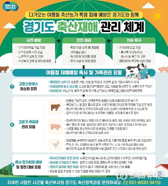 프레스유니온 김성길 기자 | 경기도가 올여름 무더위로부터 축산농가를 보호하기 위해 예산 지원과 현장점검을 아우르는 전방위적 대응에 나섰다.