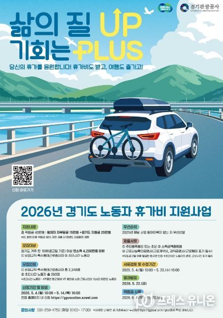 프레스유니온 김성길 기자 | 경기도가 경제적 부담으로 휴식을 포기했던 비정규직과 특수형태근로종사자에게 휴가비를 지원하는 ‘취약노동자 휴가비 지원사업’ 참여자를 5월 4일부터 14일까지 모집한다.