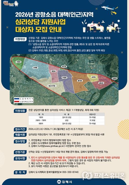 프레스유니온 강찬희 기자 | 김해시는 공항소음 대책(인근)지역 주민을 대상으로 심리상담 지원사업 참여자를 모집한다고 22일 밝혔다.