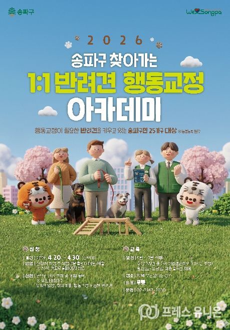프레스유니온 강찬희 기자 | 서울 송파구는 5월부터 11월까지 ‘찾아가는 반려견 행동교정 아카데미’를 운영한다고 22일 밝혔다.