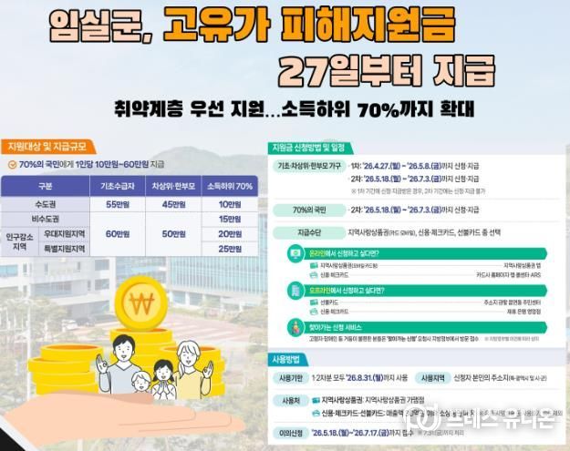 이번 지원은 2026년 3월 30일 기준 임실군에 주소를 둔 군민을 대상으로 하며, 기초생활수급자와 차상위가구, 한부모 가족을 비롯해 소득 하위 70% 범위에 해당하는 군민까지 폭넓게 포함된다.